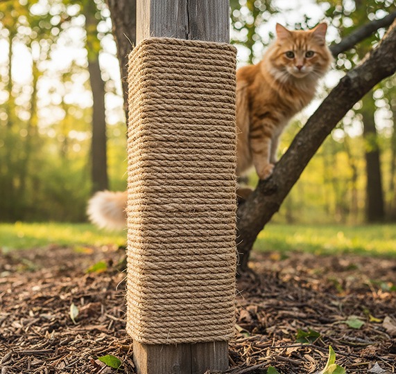 Convierte un poste vertical de tu estructura en un rascador para gatos.