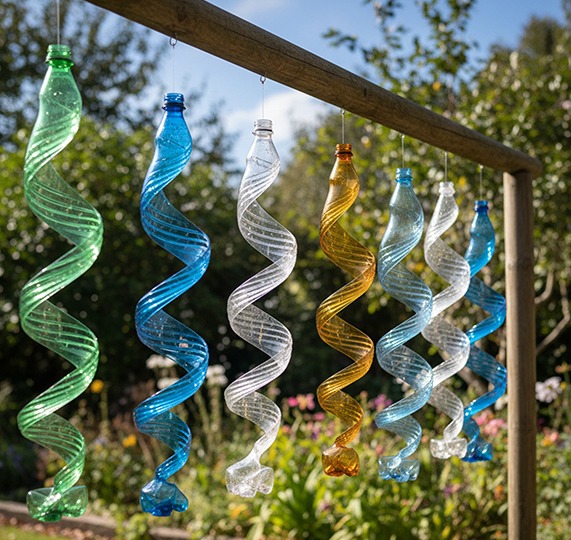 Recicla botellas viejas para crear coloridas decoraciones de jardín.